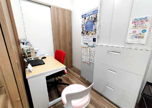 これは、糖尿病療養指導士の方が裏から情報を共有できるように設けたもので、スムーズな連携を可能にしています。一人勤務医時代からずっと仲が良くて、開業の時も「ついてきてくれますか」なんてプロポーズのようなことをして、今は遠くから通ってくださっている糖尿病療養指導士の方がいるんですが、その方専用の扉ですね。
