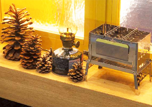 特に外観にあたる、入り口の全面サッシを利用したディスプレイのスペースは、イギリスで見た景観保全地域の二重窓にヒントを得て工夫しました。窓の内側にさらにサッシを設けて、その隙間をディスプレイのようにして小物を飾ってあります。そのスペースの下にはディスプレイ用の薪も置いてます。