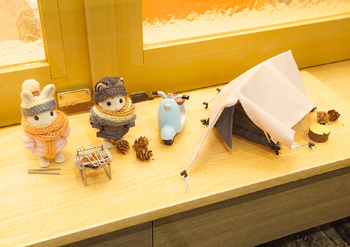 ちなみに入り口のところの、キャンプをしている人形のテントは開業前に寝ないで作った私の手作りです。指先を動かすのが好きなのです(笑)。